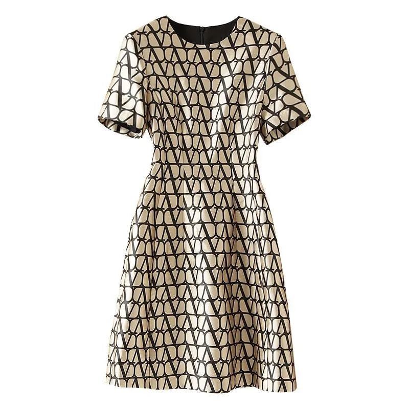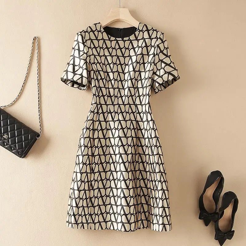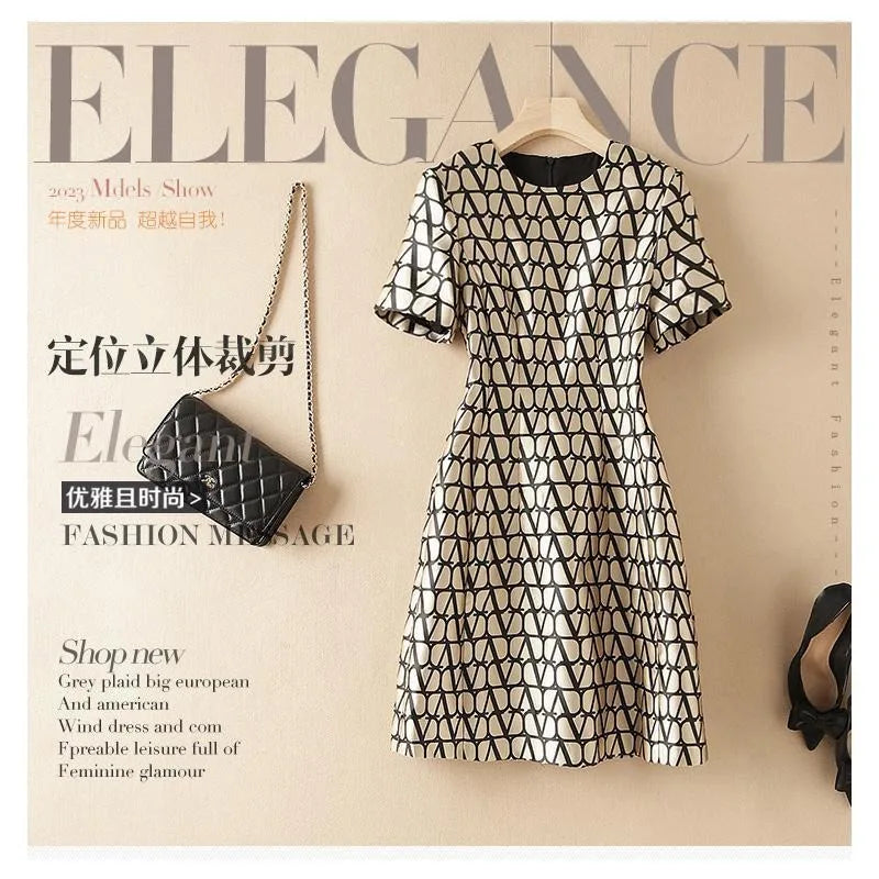Vestido Jacquard Novo de Primavera, Manga Curta, Modelo Sofisticado, Elegante para Trabalho, Decote Redondo, Ajuste Slim, Saia A-Line de Verão, 2024